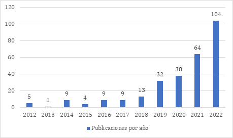 A través de la revisión bibliográfica según los criterios planteados, se encontraron un total de 288 artículos publicados. La Figura 1 presenta las publicaciones realizadas entre los años 2012 y 2022, siendo el promedio de publicaciones para este periodo de 26 artículos por año. En los primeros años la tendencia de publicaciones fue baja, teniendo para el 2012, 2013, 2014 y 2015 un total de 5, 1, 9 y 4 artículos respectivamente, con un crecimiento que se mantuvo estable en los años 2016 y 2017 con 9 artículos cada año, continuando con una tendencia de crecimiento constante que inició en el 2018 con la publicación de 13 artículos, seguido por 32 y 38 artículos en los años 2019 y 2020 respectivamente, incrementando para 2021 con 64 artículos, antes de alcanzar el pico de publicaciones en 2022 con un total de 104 artículos.
