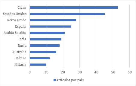 En el caso de la ubicación geográfica de estas publicaciones, la Figura 2 presenta los 10 países con mayor número de artículos publicados en este campo. Se puede evidenciar que el líder en publicaciones relacionadas con la inteligencia artificial y la educación superior es China con 53 (18.4%) artículos publicados, seguido de Estados Unidos con 45 (15.6%) artículos, Reino Unido con 28 (9.7%) artículos, España con 25 (8.7%) artículos, Arabia Saudita con 21 (7.3%) artículos, India con 19 (6.6%) artículos, Rusia con 18(6.2%), finalmente completan el conjunto Australia y México con 16 (5.5%) y 12(4.2%) artículos respectivamente, seguidos por Malasia con 10 (3.5%) artículos.