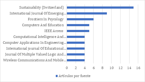 En cuanto al liderazgo en las publicaciones, China y Estados Unidos son líderes en el campo con un 18,4% y 15,6% de las publicaciones respectivamente, esto revela la participación de estas naciones en la temática estudiada. Seguido, se observa un aporte significativo por el Reino Unido, España y Arabia Saudita. Al momento de finalización de este estudio, el artículo más citado (275 citaciones) es Popenici, S.A.D. y Kerr, S. (2017). En cuanto a las fuentes, se pudo evidenciar un claro liderazgo de la revista Sustainability (Switzerland) con el 5,2% (15) de las publicaciones, seguida por International Journal of Emerging Technologies in Learning y Frontiers in Psychology con 3.1% (9) y el 2.1% (6) respectivamente.