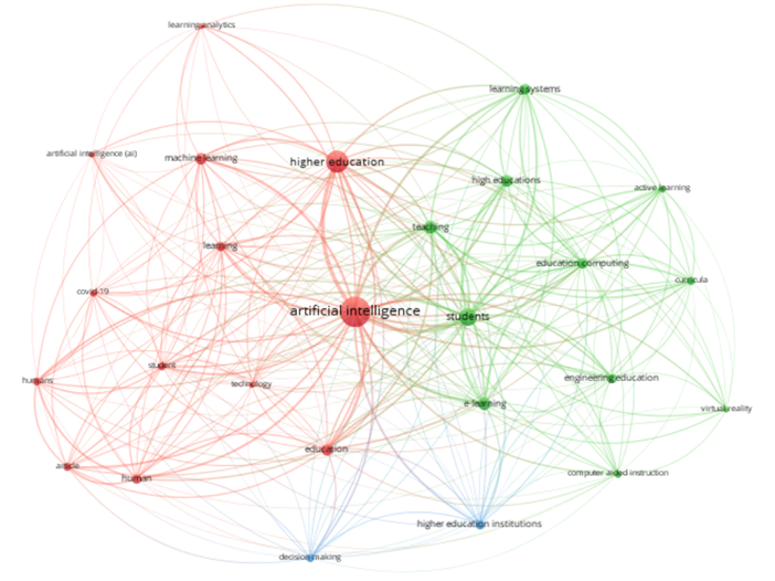 El software VOSviewer hizo la clasificación de las palabras clave en 3 clúster. Las palabras con mayor frecuencia se presentan en la Tabla 2; “Artificial intelligence” es la palabra clave con mayor frecuencia (243), seguida por “Higher education” (135), esto representa la coherencia con este estudio. Por otro lado, continua el top las palabras “Students” (80), “Teaching” (43) y “E-learning” (42).