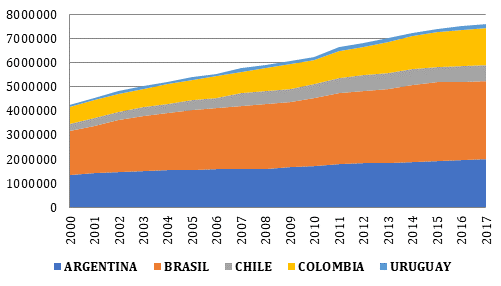 En Colombia, la información fue obtenida del Sistema Nacional de Información en la Educación Superior (SNIES), en Estadísticas se accedió a Bases Consolidadas para procesar la información necesaria. Las matrículas del nivel universitario, en Colombia son semestrales es decir que por año hay dos matriculas. Por lo cual se optó por sumar los dos semestres y hacer un promedio. En Uruguay, anualmente, el Ministerio de Educación edita el Anuario Estadístico de Educación de Uruguay, en donde se detalla la información de todos los niveles y también de ESU, con serie histórica[2].