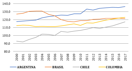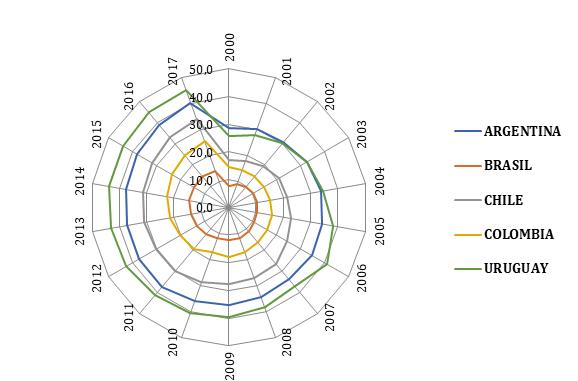 Figura 5. Índice de graduación en ESU. Países MERCOSUR, 2000-2017.