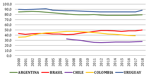 The general objective of this research is "Study the enrollment and graduation in the Universities of Argentina, Brazil, Chile, Colombia and Uruguay, in light of the national policies of democratization of education, from the year 2000 to 2018". Some authors argue that educational equity should ensure the entry, permanence and graduation of all members of a society, addressing previous inequalities of all kinds that limit people's ability to take advantage of the availability of educational institutions. ESU (Silva Laya & Rodríguez Fernández, 2012). In the last eighteen years, important government and university efforts have been made in each country to improve coverage, quality and equity in access; National systems have implemented innumerable inclusion policies. These policies have influenced access to ESU, although to a lesser extent in retention and graduation. The countries that present restrictions in access to ESU, with different selection measures, are the ones with the highest graduation indicators (Brazil, Chile and Colombia), while the free access policies (Argentina and Uruguay) achieve lower graduation percentages (Alvarez & Conci, 2020).