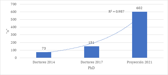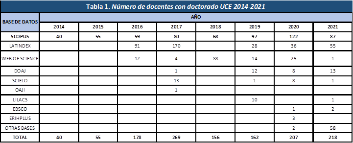 Figura 1. Número de docentes con doctorado UCE 2014-2021