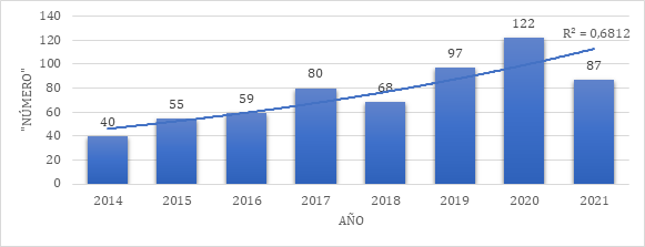 Figura 2. Publicaciones de artículos científicos en SCOPUS 2014-2021
