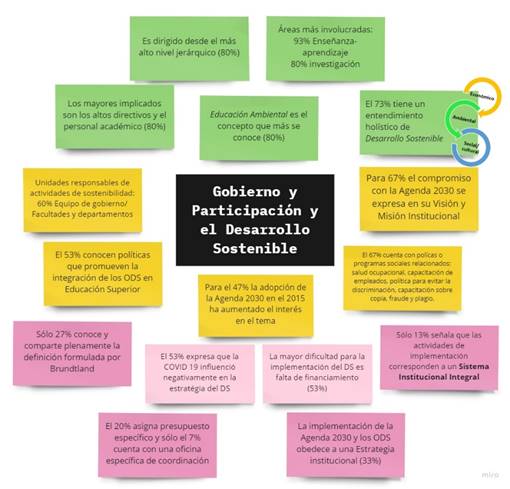 En cuanto a la participación de las IES en el impulso hacia los ODS un 60% declara que la unidad específica que se encarga de las actividades de sostenibilidad es el equipo de gobierno, las facultades y los departamentos, un 80% indica que los mayores implicados en el desarrollo sostenible son los niveles de liderazgo y el personal académico y solo el 20% señala a los socios de la comunidad. En las áreas involucradas con el desarrollo sostenible predominan la enseñanza-aprendizaje (93%), la investigación (80%), relaciones con la sociedad (73%) y funcionamiento de campus (67%) y solo el 53% indicó que la misión, visión y desarrollo de estrategias es un área involucrada.