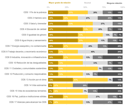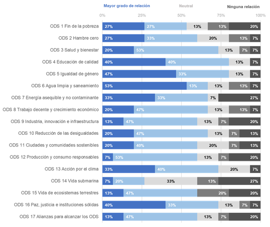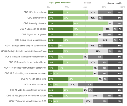 Con respecto al grado de relación de la dimensión Docencia y Formación con los ODS en las IES, la Figura 2 muestra que en todos los ODS se reconoce algún avance. El ODS4: Educación de calidad y el ODS5: Igualdad de género son los que se encuentran mejor vinculados a las acciones de formación (80%), mientras que el ODS14: Vida submarina y el ODS15: Vida de ecosistemas terrestres tienen el mayor porcentaje (40%) de poca o ninguna relación.