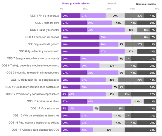 Por su parte, hay una menor relación entre el ODS2: Hambre cero y la dimensión Extensión o proyección social (40%), entre el ODS8: Trabajo decente y crecimiento económico y las dimensiones Investigación y tecnología y Extensión o proyección social (40%) y entre ODS17: Alianzas para alcanzar los ODS y la dimensión Investigación y tecnología (33%).