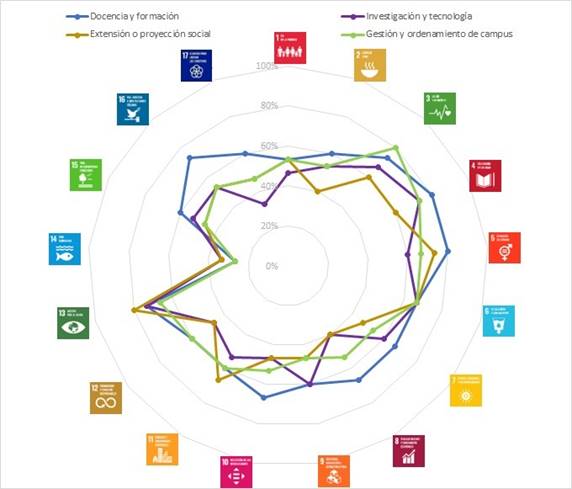 En la Figura 6 se muestra un gráfico comparativo de las dimensiones Docencia y formación, Investigación y tecnología, Extensión o proyección social y; Gestión y ordenamiento. La amplitud de cada dimensión se definió utilizando las respuestas 3 y 4 (mayor vinculación) sobre el grado de relación que los participantes otorgaron a cada ODS en las preguntas 33, 37, 41 y 46 de la encuesta.