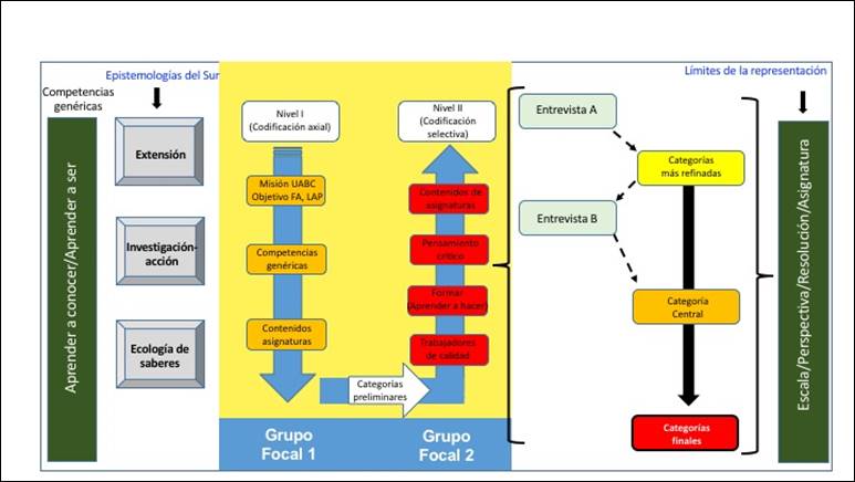 En la codificación abierta se identificaron los conceptos y las ideas más generales con las cuales se obtuvieron las primeras categorías; la codificación abierta se conformó por las primeras categorías significativas, obtenidas tanto de las competencias genéricas aprender a conocer y aprender a ser desde las cuales la UABC fomenta el humanismo, y por las áreas de acción sugeridas por el anclaje teórico (extensión, investigación-acción y ecología de saberes).