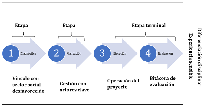 Con una preparación crítica en combinación con los vínculos generados con la comunidad, el alumno tendrá más herramientas para enriquecer su diferenciación disciplinar y experiencia sensible. Se sugiere una ecología de saberes dividida en cuatro etapas que pueden corresponder con las etapas de formación (ver figura 3). En la etapa de diagnóstico el estudiante deberá vincularse con algún sector social desfavorecido y entablar un primer acercamiento que le permita familiarizarse con él identificando sus problemáticas. Con las problemáticas identificadas, podrá iniciar las gestiones con actores clave que puedan involucrarse en su resolución para así empezar con la etapa de ejecución. Al final de su formación académica estará en condiciones de realizar una bitácora de evaluación con el fin de que su relevo mejore las condiciones encontradas.