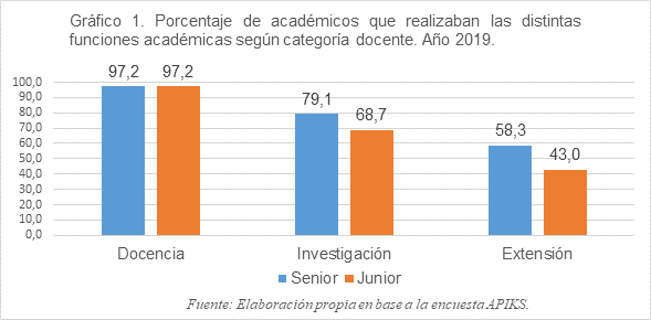 Considerando que este estudio se centra en la función docente, se analizaron únicamente las respuestas de aquellos profesores de universidades nacionales que declararon haber desarrollado actividades de enseñanza. Al respecto, se destaca que dicho grupo representa el 97,6% de la población total encuestada[19]. Lo anterior, refuerza la idea de que el elemento común de la profesión académica argentina es el desarrollo de la función docente. En contraste, el porcentaje de académicos que realizan tareas de investigación y/o de extensión es relativamente menor (Ver gráfico 1).