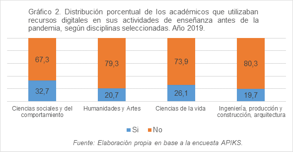 En primer lugar, se indagó cuál era la proporción de académicos que utilizaban recursos digitales antes de la pandemia (en carreras presenciales y/o de EaD). Se observa que solo el 29,5% de los académicos incorporaba este tipo de recursos. Al respecto, cabe señalar que no se observaron diferencias importantes en función de la categoría de los docentes (agrupamiento de profesores o de auxiliares docentes).