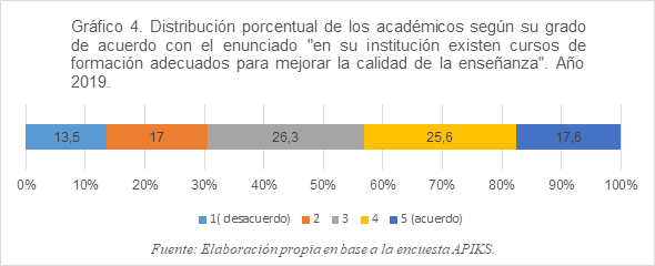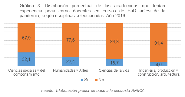 De manera congruente con el estado de desarrollo incipiente de la EaD, los resultados del estudio APIKS mostraron que, antes de la pandemia, los académicos argentinos tenían escasa experiencia en cursos de EaD y en el uso de recursos virtuales (solo el 29,5% de los académicos incorporaba recursos digitales en sus actividades de enseñanza y solamente el 23,3% había dictado alguna vez un curso de EaD). Además, pudo identificarse otro factor crítico: el 30,5% de los académicos manifestó que su universidad no le ofrecía cursos de formación adecuados para mejorar la calidad de la enseñanza.