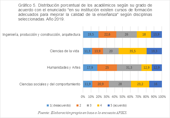 Nuevamente, las diferencias se relacionan con la variable disciplinar. Los académicos de ciencias de la vida constituyen el grupo que expresó su mayor grado de acuerdo con el enunciado (Ver gráfico 5). Sobre las causas de este fenómeno, se podría suponer la existencia de una relación con los procesos de evaluación y acreditación universitaria ya que Medicina fue la primera carrera en el país que participó en procesos de evaluación externa, en base a una serie de estándares que tempranamente incluyeron la obligación de ofrecer cursos de formación docente (RM Nº535-99)[21].