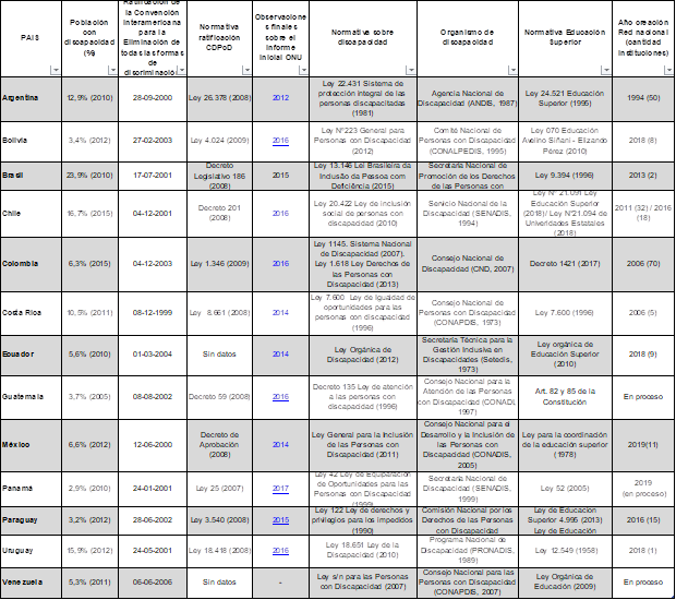 Los resultados se presentan primero, de manera global, a fin de apreciar la región de América Latina y del Caribe en su conjunto. Así, en el cuadro 1, se observa la población con discapacidad por país, documentos que avalan la firma de la ratificación de la Convención Interamericana para la eliminación de todas las formas de discriminación de esta población, informes de observaciones de la ONU, normativas y organismos; y finalmente normativas especificas en educación superior y años de creación de redes de educación superior.