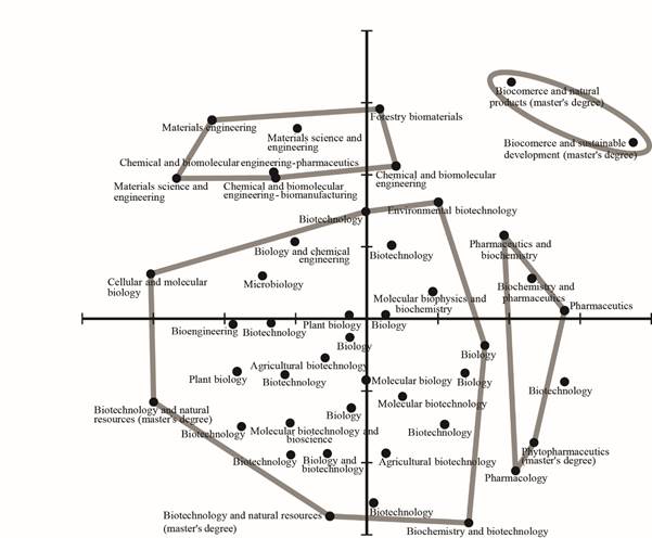 The distribution of programs in the space of figure 1 showed considerable spread. However, it was possible to establish regions of such a space as areas of knowledge. The two biocommerce programs included in the sample form a cluster that is distinct from the other three groups of programs. The largest group, at the center of figure 1, contained a diverse set of programs associated with biotechnology and biology, with no definite structure within its boundaries. However, the former was reasonably distinct from a group formed mostly by pharmaceutics programs (center-right of Figure 1) and a group composed of bioengineering and biomanufacturing (upper-left of Figure 1). The differences in academic programs curricula could be self-evident for experts in the field; yet, as both groups of academic programs are considerably distant from each other in the MDS, substantial effort will be required to combine biotechnology and biocommerce in a single course curriculum. The former was a proposal made during the initial steps of the design.