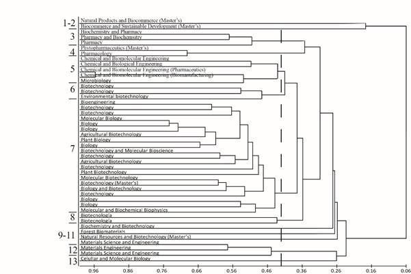 In the dendrogram depicted in Figure 2, Biocommerce programs (Groups 1 and 2) have the lowest similarity overall to other groups of programs, as they cluster last. Pharmacy forms a distinct cluster (Group 3) that has affinities to the cluster containing Pharmacology and Pharmaceutics (Group 4). Engineering programs in Chemistry and Molecular Biology cluster together in group 5. The latter group also contains a Microbiology program. Group 6 comprises three programs in Biotechnology that have a curricular structure dissimilar enough to be distinguished from Group 7. The latter is formed mostly by programs in Biology and Biotechnology. However, Group 7 contains also Bioengineering and Biophysics programs. Group 8 is formed by two Biotechnology programs that are more similar to each other than to the rest of the Biotechnology programs in Group 7. Groups 9 to 11 and 13 are formed by individual programs each. Finally, Group 12 contains Engineering programs in Materials Sciences.