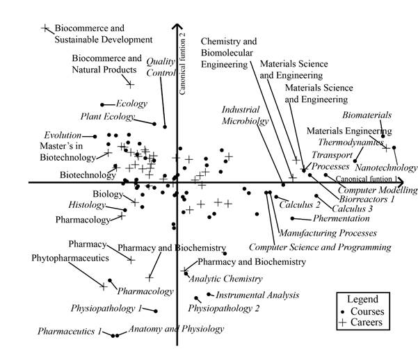 Figure 4. A biplot inferred by a correspondence analysis of 45 careers and their courses in Group 2 (see Section 3.4). It was possible to establish three distinct areas of knowledge. Percentages indicated on each axis represent the proportion of inertia or lack of independence between careers and courses explained by each canonical vector.