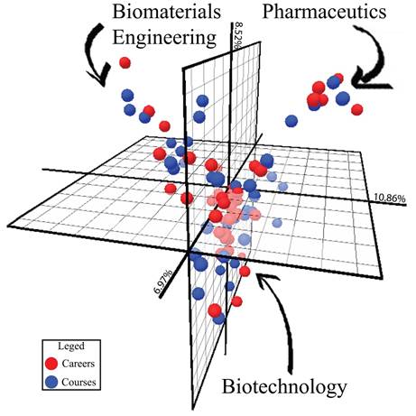 A three-pronged scatter was formed by programs and courses in Figure 4. These three ‘prongs’ belonged to different areas of knowledge and were constituted by three areas of knowledge that we defined as Pharmaceutics, Biomaterials Engineering, and Biotechnology. Although it was not possible to depict names of individual courses and programs due to limitations in the available space in Figure 4, it was clear that there was a definite structure in which particular regions of the inferred space were occupied by specific academic programs and their corresponding courses. The latter may not be fully compatible across academic program curricula.