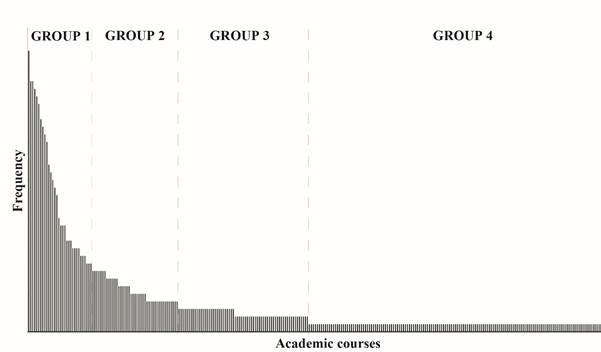 Figure 5. A histogram that summarizes the presence and relevance of 285 courses in 45 university careers. A more extensive and detailed histogram can be requested from the first author.