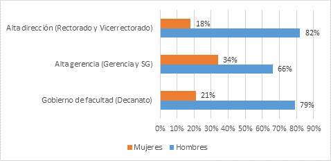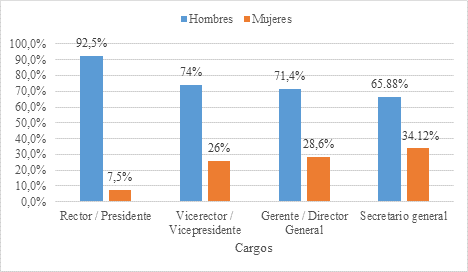 Así, a nivel de evidencia, se encuentra que hay poca participación de las mujeres en los órganos de gobierno universitario, debido a que en los cargos de rectoría y decanato la participación de las mujeres es de menos de un tercio, mientras que, en los puestos de alta gerencia, el porcentaje de mujeres llega al 34 %. Estas tendencias nacionales tienen pocas variaciones según el régimen de la universidad (pública o privada), el dominio territorial o el nivel académico de la misma, siendo las universidades societarias donde hay más mujeres por puestos analizados en la alta gerencia o el gobierno de facultad.
