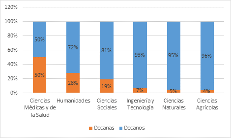 Asimismo, los indicadores a nivel de gobierno de las facultades repiten la tendencia, habiendo notables excepciones en las facultades de ciencias de la salud, en donde casi la mitad de las autoridades son mujeres. Es así que, la proporción de los campos vinculados a las ciencias y la tecnología (naturales, agrícolas y las ingenierías) es de 1 decana por cada 20 decanos hombres. En todos los casos, se trata de una proporción más baja que el promedio en América latina y el Caribe.