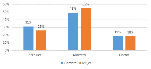 Haciendo ese corte por sexo, encontramos que el 68 % de los hombres docentes cuentan con un postgrado, mientras que, en el caso de las mujeres, este porcentaje llega a 73 %, siendo mayor la proporción en aquellos que cuentan con maestría: