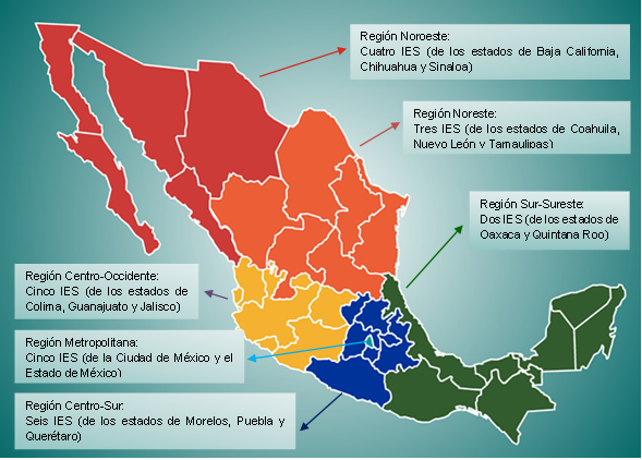 La recolección de datos se realizó entre el 12 y el 24 de marzo de 2021. Se obtuvieron respuestas de 25 instituciones, que representan aproximadamente el 30% de las IES representadas en AMPEI. La muestra incluyó IES de los sectores público y privado, ubicadas en 16 entidades federativas y seis regiones geográficas (ver tabla 1 y figura 2).