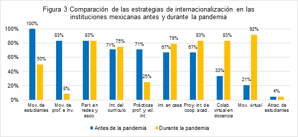 A partir de lo anterior, se puede señalar que, antes de la pandemia, la mayoría de las universidades mexicanas impulsaban la movilidad como principal estrategia de internacionalización, aunque muchas de las instituciones más consolidadas y con mayor reconocimiento en el país, tanto públicas como privadas, tenían avances en otras estrategias tales como la colaboración internacional para la investigación, el reclutamiento de estudiantes extranjeros en búsqueda de grado, las actividades de internacionalización en casa y la enseñanza de lenguas extranjeras. Por tanto, si bien es cierto que las acciones de internacionalización se realizan en general de manera desarticulada, sin suficiente planeación y carentes del respaldo de políticas de internacionalización a nivel institucional o gubernamental y que la movilidad estudiantil se ha constituido como la estrategia más relevante y visible en las IES mexicanas, no se puede negar el esfuerzo de algunas instituciones por incluir y consolidar estrategias adicionales a la movilidad.