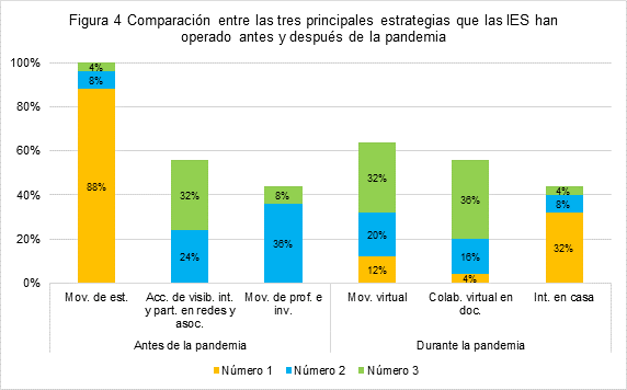 A fin de identificar la forma y dimensión de los cambios que las IES han tenido que implementar en sus estrategias de internacionalización a consecuencia de la pandemia, es menester definir un antes y un después, ya que no existe información detallada al respecto en la literatura. Las primeras preguntas del estudio identifican y contrastan las estrategias de internacionalización en operación antes y durante la pandemia.