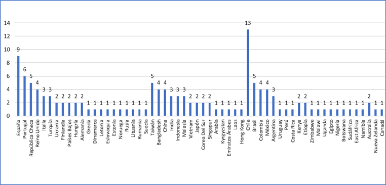 El conjunto de las nacionalidades de las filiaciones institucionales de los primeros autores de los 186 artículos seleccionados en la fase final de la revisión presenta una gran dispersión: 58 países. La filiación institucional de los primeros autores de casi la mitad (47%) de los artículos seleccionados corresponde a 21 países europeos, las dos terceras partes de ellos de Europa occidental: Inglaterra, Escocia, Alemania, España, Países Bajos, Bélgica, Portugal, Italia, Dinamarca, Irlanda, Francia, Finlandia, Noruega, Suecia; el 19% corresponde a 16 países asiáticos y el 15% a 7 países latinoamericanos; el 18% restante se distribuye en porciones bastante similares entre 14 países: 10 de África (7%), 2 de Oceanía (6%) y 2 del área anglófona de América del Norte (EE.UU. y Canadá, 5%).