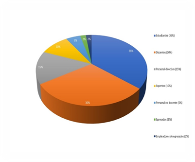 Tal como se ilustra en el Gráfico 4, en las dos terceras partes del total de 131 artículos las unidades de análisis consideradas fueron las conformadas por estudiantes y por docentes, en el 36% y en el 30% del total de menciones respectivamente. También se consideraron como unidades de análisis las conformadas por integrantes del personal directivo (15%), expertos (10%), personal no docente (5%), egresados (2%) y empleadores de egresados (2%).