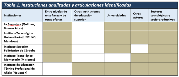 El análisis comparado de los casos seleccionados permite identificar los tipos de articulaciones que cada institución despliega, como se presenta en la Tabla 1.