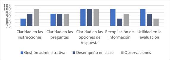 En primera instancia, es posible vislumbrar que la construcción del instrumento de evaluación “Evaluación del desempeño docente” fue un proceso participativo de toda la comunidad universitaria, contemplando las necesidades de la administración, el estudiantado y, no menos importante, del profesorado, lo cual es un gran resultado, ya que según Mula, Cruz y Caballero (2021) es indispensable que el instrumento sea de utilidad para el profesorado de manera que sus resultados tengan un impacto operativo y concreto en su quehacer profesional.