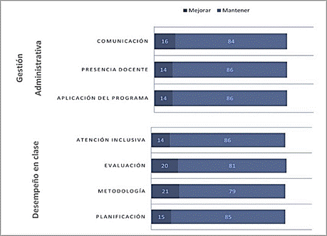 En cuanto a las variables, se infiere un desempeño “muy bueno” en la gestión administrativa, siendo la presencia docente y el seguimiento del programa las principales fortalezas y un desempeño en clase “bueno”, siendo la atención inclusiva y la planificación los puntos altos de esta variable. Se resalta que ambas variables, en igual peso, se encuentran alta y significativamente correlacionadas con el desempeño docente.