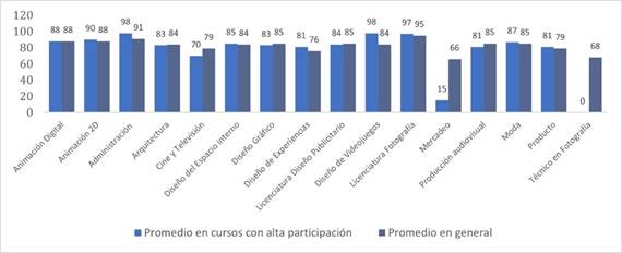 Sin embargo, la calificación deficiente del 19% de los cursos baja este promedio, siendo claro, que se le debe prestar mayor atención a la carrera de Mercadeo cuya puntuación en el desempeño es significativamente más baja en comparación con la mitad de las carreras, y preocupa también, la puntuación media del técnico en Fotografía, caso interesante, porque el personal docente de este técnico suele ser el mismo de la licenciatura de Fotografía, programa que posee un alto desempeño docente.