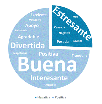 En segundo lugar, están las frases negativas (19%), es decir, reflejan crítica, enojo o insatisfacción, por ejemplo, “mucho estrés ya que no se le entiende bien a el docente (…)” (evaluación 84). Por último, se encontraron frases neutrales (13%), es decir, que informan hechos, más no expresan emociones o indican aspectos favorables y desfavorables en equilibrio, por ejemplo, “no me hizo sentir ni bien ni mal” (evaluación 3370). La figura 1 muestra las palabras con más de 10 menciones en frases positivas y negativas del último ítem.