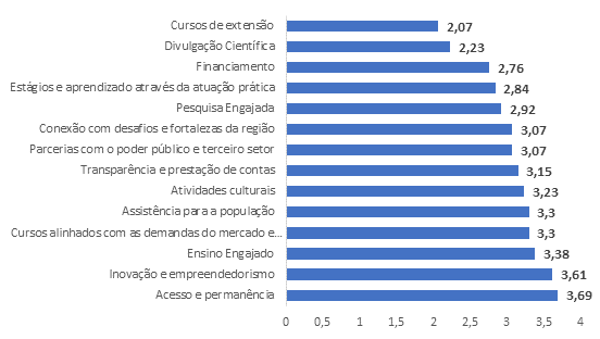 É importante destacar que grande parte dos temas tiveram nota superior a 2, porém em comparação às outras universidades analisadas, há muito espaço para que elas desenvolvam seus planejamentos em relação ao engajamento com a sociedade.