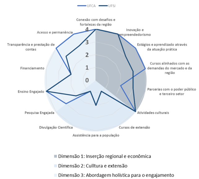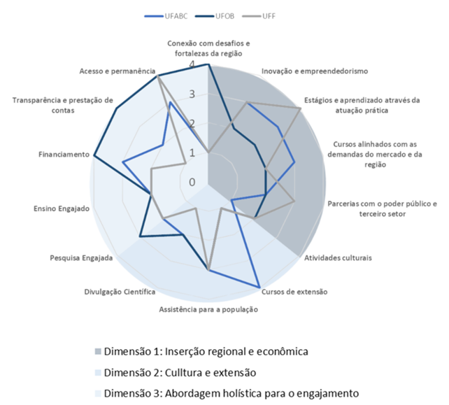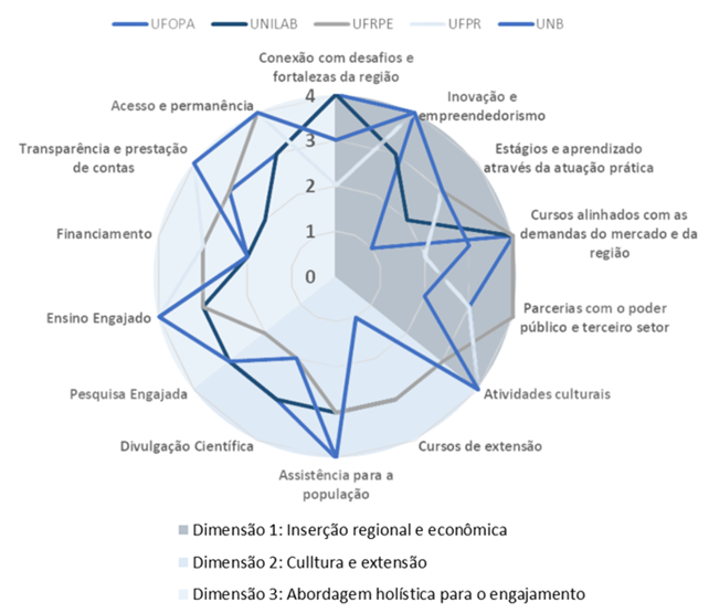 Na análise dos PDIs, a Universidade Cívica contribui para todas as três dimensões, abordando praticamente todos os temas. A primeira dimensão Inserção regional e econômica foi concebida a partir do forte senso de localidade proposto pelo modelo, envolvendo parcerias com o poder público, estágios e conexão com os desafios da região. Para a segunda dimensão do instrumento, o modelo traz a ideia de cursos de extensão, atividades culturais e de assistência. Por fim, na terceira dimensão, o modelo levou à inclusão dos temas de ensino e pesquisa engajados, principalmente pela abordagem holística do engajamento da universidade com a sociedade e também os temas de financiamento prestação de contas.