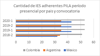 Realizando un análisis de la versión presencial, en base a las estadísticas de movilidad PILA 2018-2 a 2020-1, podemos señalar que existe una media de 127 IES de: México, Colombia, y Argentina que participaron de manera activa. Aclarando, que el número de instituciones se sostuvieron en la mayoría de los casos, durante las diferentes convocatorias presenciales, tal como se expresa en el gráfico 1.
