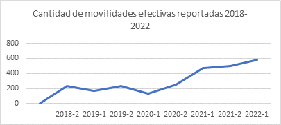 En este último caso, se observa que las movilidades efectivas reportadas en el programa se mantenían con un tenue equilibrio. En tanto, a partir del surgimiento de las propuestas virtuales asciende de manera continua, y, llega a duplicarse en la convocatoria 2021-2.