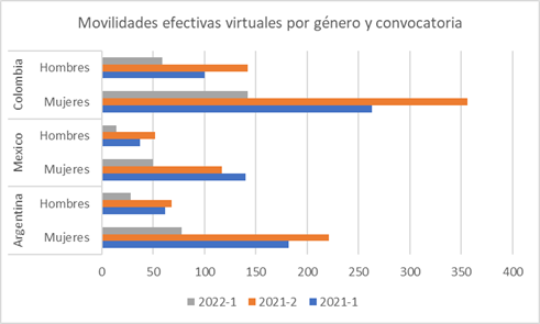 En el gráfico 6, anteriormente presentado, se observa que las mujeres han tenido un mayor peso relativo, pues, en el total acumulado de las convocatorias de los años 2021 y 2022, de los tres socios principales, han llegado casi a triplicar la cantidad de movilidades efectivas masculinas.