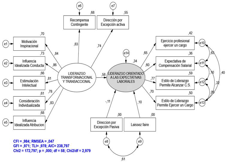 El modelo estructural de liderazgo orientado a las expectativas laborales de los estudiantes está compuesto por una variable latente, denominada “Liderazgo transformacional y transaccional” conformada por los indicadores de las variables observables motivación inspiracional, influencia idealizada conducta, estimulación intelectual, consideración individualizada, influencia idealizada atribución, recompensa contingente, dirección por excepción activa, a los que explica con betas entre .74 a .86. Así también está conformado por dos variables observables denominadas “Dirección por excepción pasiva” que influye con una beta -.11 y “Laissez faire” que influye con una beta .10.