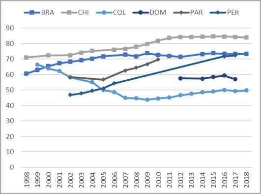 Aquellos países en donde la matrícula en la educación superior privada sobrepasa el 50% de la matrícula total serán clasificados en el grupo con “privatización alta”. En esta categoría, por tanto, se incluye a Brasil, Chile, Colombia, República Dominicana, Paraguay y Perú. Cabe mencionar, además, estos países incrementaron paulatinamente sus niveles de privatización en educación superior, tal como lo muestra el Gráfico 1.