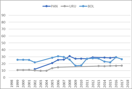 Finalmente, aquellos países en donde la proporción de la matrícula en la educación superior privada equivalga a menos del 30% de la matrícula total, se ubicarán en el grupo con “privatización baja”. En esta categoría se encuentran los casos de Panamá, Uruguay y Bolivia, cuya evolución de la matrícula se muestra en el Gráfico 3. Si bien se distinguen variaciones a lo largo del tiempo, éstas no superan el rango del 30% durante el período entre 1998 y 2018.