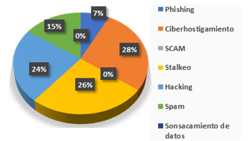 Al respecto, la mayoría de los estudiantes encuestados (62%) desconoce el uso de recursos informativos para la protección contra ciberdelitos, en particular, contra el acoso cibernético. En cuanto a la seguridad de hardware, software y red, la mayoría relativa de los encuestados (38%) utiliza como recurso preferido, las alarmas contra intrusos. Los estudiantes consultados señalan que, a pesar de conocer diversos recursos, no los utilizan porque los recursos más efectivos conllevan un pago por licencia de activación, siendo su costo, según los encuestados, relativamente caro. Otra dificultad para los estudiantes es el idioma de los recursos, desconociendo el inglés.