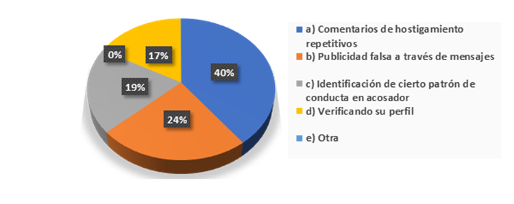 Por otro lado, los patrones de los ciber-acosadores son actividades rutinarias realizadas por estos y la aparición de un suceso desencadenante como un objetivo disponible, pero todo esto está determinado por un esquema que se forma el infractor en su mente como resultados de actividades realizadas cotidianamente (Andresen, 2014). De acuerdo con los encuestados, el patrón más comúnmente identificado en los perpetradores de ciberdelitos es la emisión repetitiva de comentarios hostiles. Estos hallazgos ofrecen una perspectiva detallada sobre las percepciones de los participantes respecto a los patrones predominantes en los autores de delitos cibernéticos.