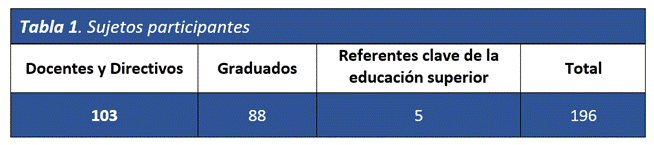 El diseño metodológico asumió un enfoque mixto, de alcance descriptivo. El estudio se centró en las universidades del Paraguay. La unidad de análisis estuvo conformada por los representantes de las universidades, mientras que los sujetos participantes fueron los directivos, docentes, graduados y otros actores clave en el ámbito de la educación superior. La recolección de datos se realizó a partir de la aplicación de encuestas, entrevistas, y del análisis documental. La población de interés se centró en representantes de 55 universidades en Paraguay, al año 2019, de las cuales 9 son públicas y 46 privadas. En las encuestas participaron 103 directivos y docentes de 8 universidades seleccionadas, 88 graduados de las mismas universidades; mientras que, en las entrevistas, participaron 5 referentes clave de la educación superior del país, seleccionados según criterios preestablecidos. La selección de los sujetos participantes, denominada también casual, incidental, deliberada, se debió a contar con accesibilidad hacia los participantes del estudio en el momento del estudio, como recoge Campoy-Aranda (2018). De modo que, los sujetos participantes se visualizan en la tabla 1.