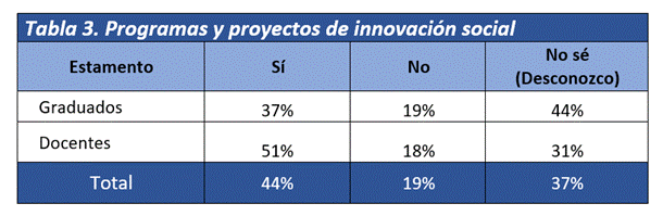 Respecto al rol de las universidades frente a los desafíos contemporáneos de la sociedad, se obtuvieron los siguientes hallazgos. En relación con la orientación de los programas educativos de la institución para promover el desarrollo de habilidades de reflexión y análisis crítico vinculadas a la innovación y el compromiso social a lo largo de la formación, se observan los siguientes resultados: La mayoría de las universidades paraguayas (56%) carecen de una difusión adecuada o no están al tanto de la implementación de programas y proyectos de innovación social dirigidos a abordar problemáticas de equidad, inclusión social y desarrollo sostenible. Esta falta de conocimiento es aún más pronunciada entre los graduados, alcanzando casi el 63% (Tabla 3).
